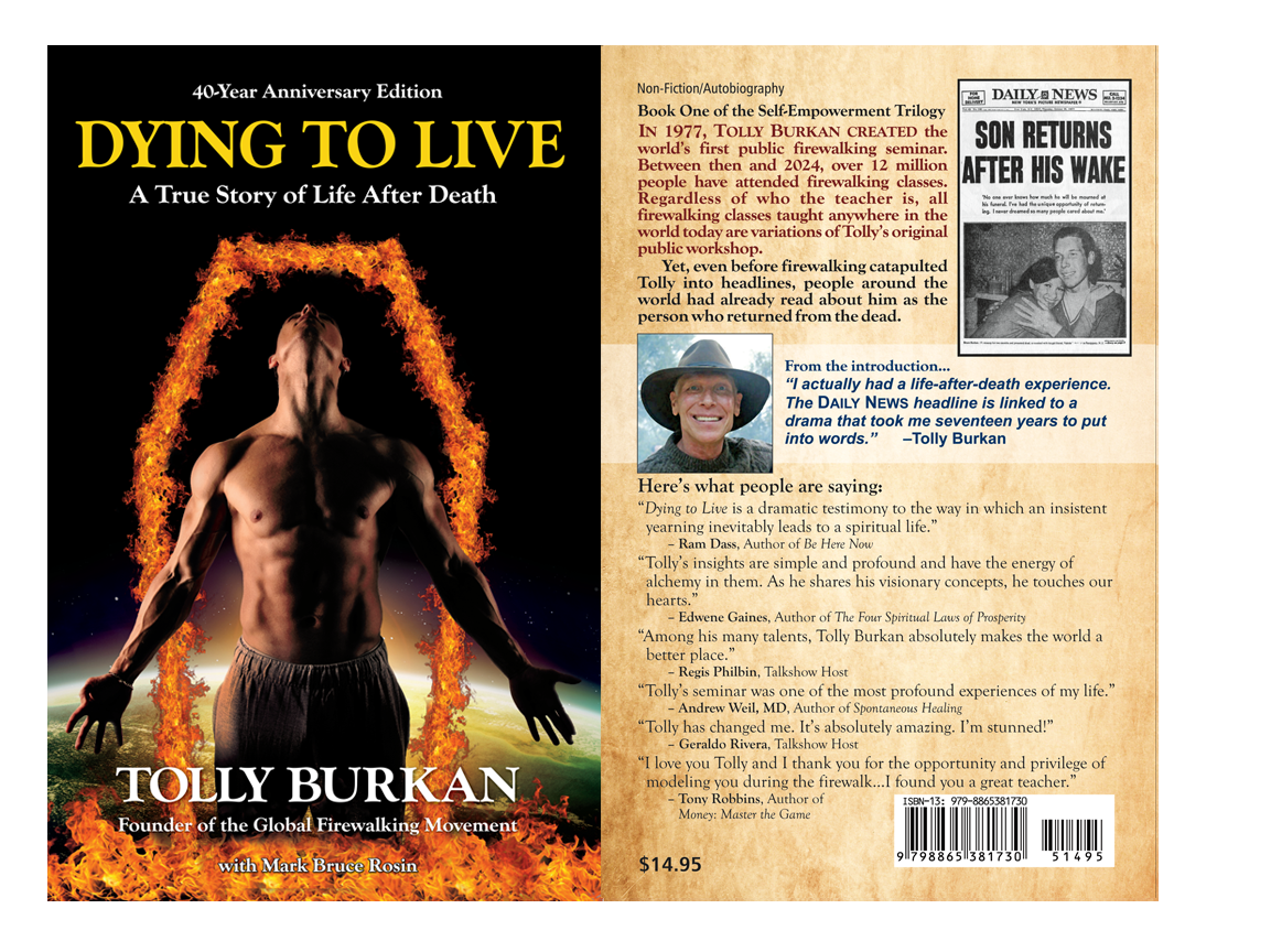 The "Birth of the Global Firewalking Movement" is dramatically described in Tolly Burkan's autobiography: Dying to Live. This inspirational, self-help book describes how Tolly consciously created the firewalking movement after turning his life around following two suicide attempts. Dying to Live details the two decades before Tolly taught firewalking to the public and before he taught firewalking to Peggy Dylan and Tony Robbins. It talks about why he created the seminar and how it launched a global movement. The book reads like a novel and you will find it hard to put down. (If you write book reviews — or blogs — please request a FREE review copy)